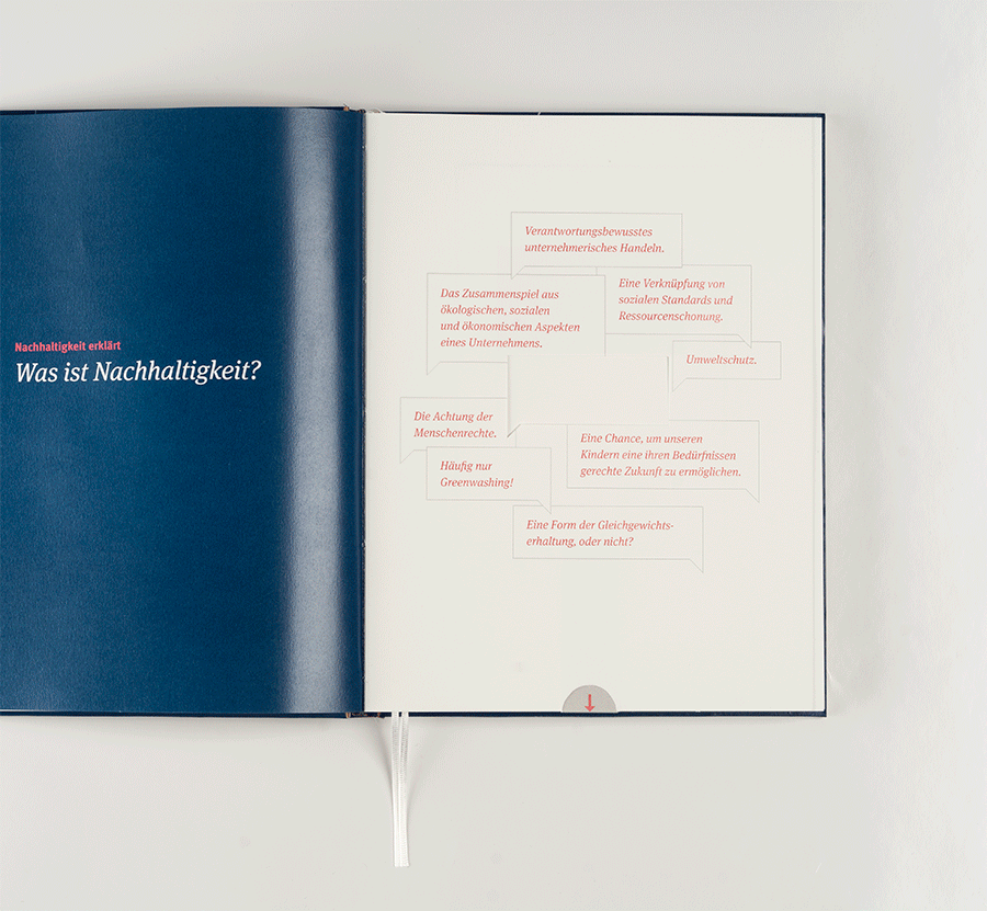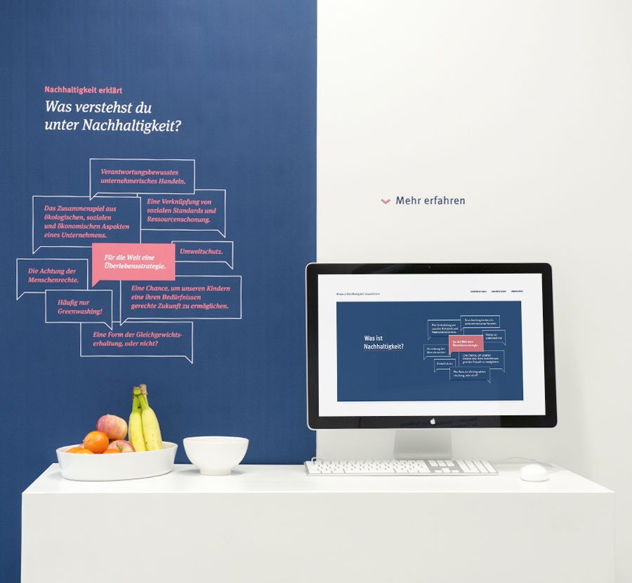 Unsere Arbeit basiert auf drei, aus der Definition unserer Ziele und Aufgaben abgeleitete, Kernwerte. 1. Bewusstsein für Nachhaltigkeit: Ziel unserer Arbeit ist es Bewusstsein für Nachhaltigkeit zu schaffen. Dies wird durch eine verstärkte Interaktion mit allen Sinnen ermöglicht, was dem Inhalt eine thematische Tiefe gibt. Der Nutzer kann durch eigene Erfahrungen selbstständig einen Zugang zu den Informationen schaffen und entscheidet über deren Tiefe. 2. Konzentration der Inhalte: Es ist wichtig die Inhalte konzentriert und vereinfacht wiederzugeben. Vor allem bei Nachhaltigkeit ist es erforderlich die Zusammenhänge und Verknüpfungen mit dem unternehmerischen Handeln klar darzustellen. 3. Glaubwürdige Kommunikation: Als Basis für eine Berichterstattung über Nachhaltigkeit ist ein glaubwürdiger Inhalt sowie eine glaubwürdige visuelle Form wichtig. Erst wenn durch die kompetenten Inhalte, wie beispiels- weise durch die beiden entwickelten Studien, und durch eine vertrauensvolle Erläuterung des Mehrwerts von Nachhaltigkeit sowie der Empfehlungen ein Fundament gebildet wird, ist die Arbeit glaubwürdig.