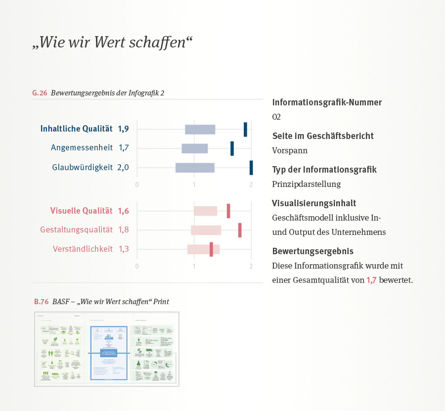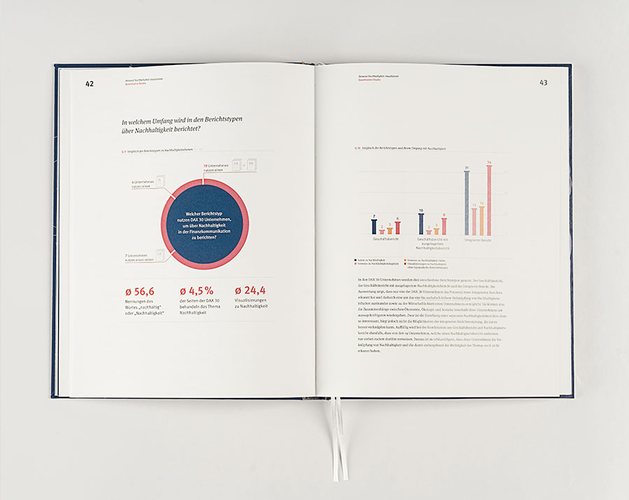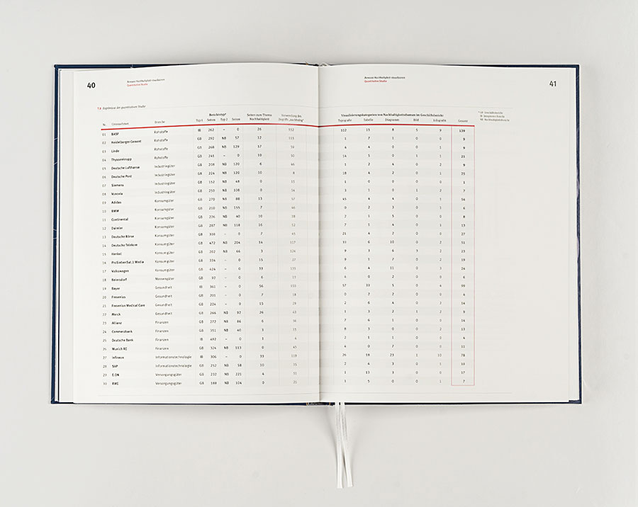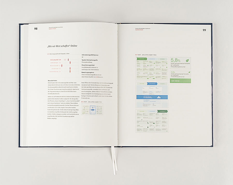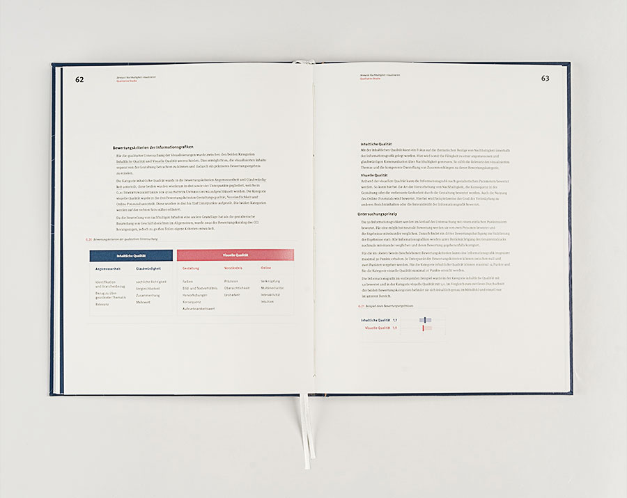 Die qualitative Studie beschäftigt sich mit der aktuellen Funktion und den Stärken von Informationsgrafiken zur Visualisierung von Nachhaltigkeit. Das wesentliche Ziel der Auswertung ist somit, die Qualität der Informationsgrafiken festhalten und beurteilen zu können. Das zweite Ziel ist, Kriterien sowie inhaltliche und gestalterische Empfehlungen zur Optimierung der Visualisierung zu Nachhaltigkeit aus den Ergebnissen abzuleiten. Die Ergebnisse dienen dann als Basis, um für die Nachhaltigkeitsthematik eine glaubwürdigere und anspruchsvollere Visualisierung in Geschäftsberichten zu ermöglichen.