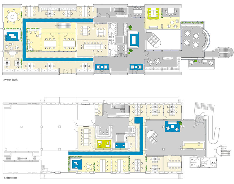 Im Zuge des Projektes entstand ein Konzept auf Basis der "Grünen Wiese". Die Grundrisse zeigen die Aufteilung der Arbeitsplätze auf den gestalteten Etagen. Die neue Arbeitswelt wurde in 22 Bereiche gegliedert, die bis ins Detail erarbeitet worden sind. Die Gestaltung ist so konzipiert, dass sie modular funktioniert und in der individuellen Umsetzung weiter angepasst werden kann.